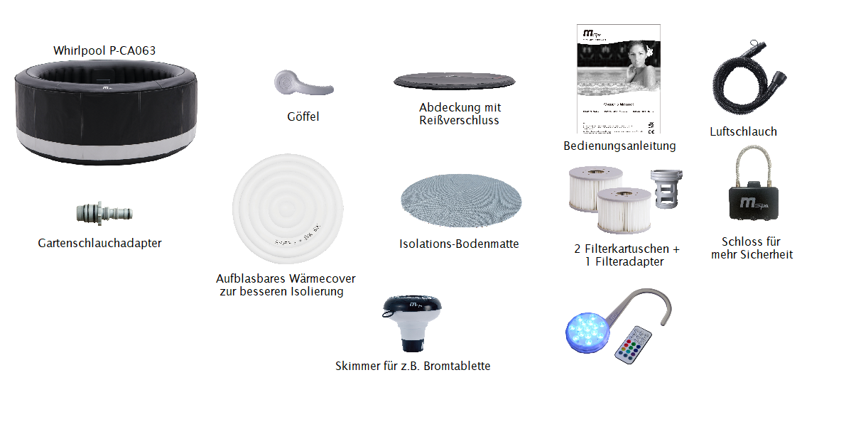| Lieferumfang | MSpa Whirlpool Premium Camaro P-CA063 inkl. integrierter Technikbox und vollständigen Montagematerial (Bedienungsanleitung, aufblasbares Wärmecover, Whirlpool-Abdeckung mit Schnallenverschluss in anthrazit, 2x MSpa Filterkartuschen + 1 Stück MSpa Filteradapter, 1x Göffel, Bodenpuzzlematte, Gartenschlauchadapter, Luftschlauch, Teststreifen, Skimmer z.B. für Bromtabletten) sowie 1x MSpa Unterwasser LED mit Aufhängung für Filter zur Beleuchtung des Wassers |