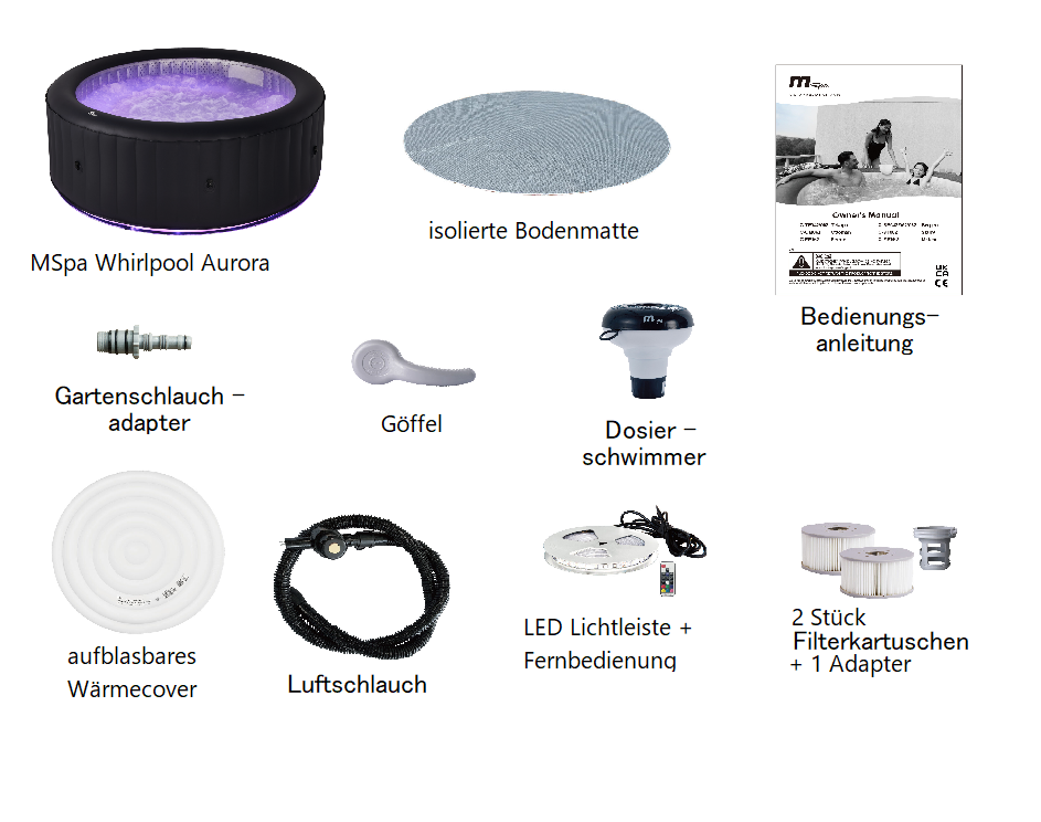 | Lieferumfang | MSpa Whirlpool Urban Aurora U-AU062 inkl. integrierter Technikbox und vollständigen Montagematerial (Bedienungsanleitung, aufblasbares Wärmecover, Whirlpool-Abdeckung mit Schnallenverschluss in anthrazit, 2x MSpa Filterkartuschen + 1 Stück MSpa Filteradapter, 1x Göffel, Bodenpuzzlematte, Gartenschlauchadapter, Luftschlauch, Teststreifen, Skimmer z.B. für Bromtabletten) |