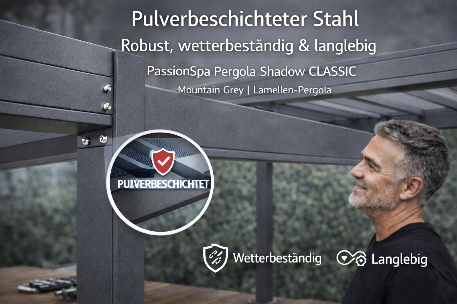 Die PassionSpa Pergola Shadow CLASSIC überzeugt mit einer hochwertigen Konstruktion aus pulverbeschichtetem Stahl – eine starke Basis für eine langlebige und wetterbeständige Pergola im Außenbereich. Laut Produktbeschreibung besteht die Shadow-Serie aus hochwertigem, pulverbeschichtetem Stahl, wobei die Pulverbeschichtung den Stahl optimal schützt. Genau das ist im Alltag ein entscheidender Vorteil: Die Oberfläche ist widerstandsfähig, pflegefreundlich und auf eine langfristig zuverlässige Nutzung auf Terrasse, im Garten oder im Spa-Bereich ausgelegt. Vorallem bei einer Pergola mit Lamellendach zählt nicht nur die Optik, sondern auch die Materialqualität. Der pulverbeschichtete Stahl verleiht der Konstruktion eine wertige, moderne Anmutung in Mountain Grey (anthrazitgrau) und unterstützt zugleich Stabilität und Beständigkeit bei wechselnden Wetterbedingungen. So investieren Sie in eine stilvolle Outdoor-Lösung, die Funktion, Schutz und eine dauerhaft hochwertige Ausstrahlung überzeugend miteinander verbindet.