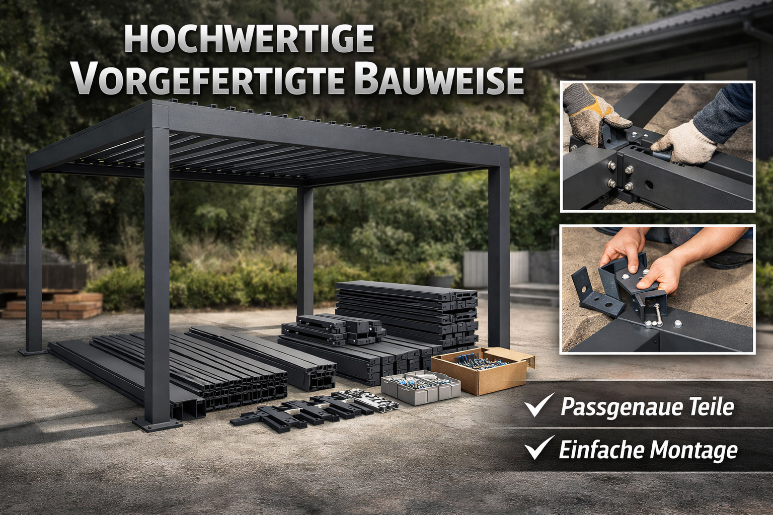 Die PassionSpa Pergola Shadow CLASSIC punktet nicht nur mit modernem Design, sondern auch mit einer besonders montagefreundlichen Bauweise. Laut Produktbeschreibung wird die Pergola mit vorgefertigten Profilen und einer detaillierten Anleitung geliefert und ist dadurch sehr einfach zu montieren und zu installieren. Das reduziert den Aufwand beim Aufbau spürbar und sorgt für einen strukturierten, unkomplizierten Montageprozess. Gerade bei einer hochwertigen Pergola mit Lamellendach ist ein durchdachtes Aufbaukonzept ein echter Vorteil: Die vorbereiteten Bauteile unterstützen eine effiziente Montage, während die klare Anleitung für zusätzliche Sicherheit bei der Installation sorgt. So kommen Sie schneller zum Ergebnis – und können Ihre neue Outdoor-Pergola zügig in Betrieb nehmen.